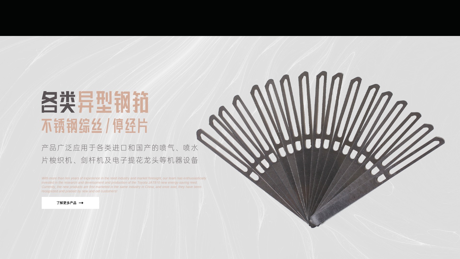 公司主要產(chǎn)品有:噴氣織機(jī)用各類異型鋼筘(傳統(tǒng)型豐田JAT710鋼筘及新研發(fā)的豐田JAT810節(jié)能筘);不銹鋼綜絲及不銹鋼停經(jīng)片。我們的產(chǎn)品廣泛應(yīng)用于各類進(jìn)口和國(guó)產(chǎn)的噴氣、噴水、片梭織機(jī)、劍桿機(jī)及電子提花龍頭等機(jī)器設(shè)備。